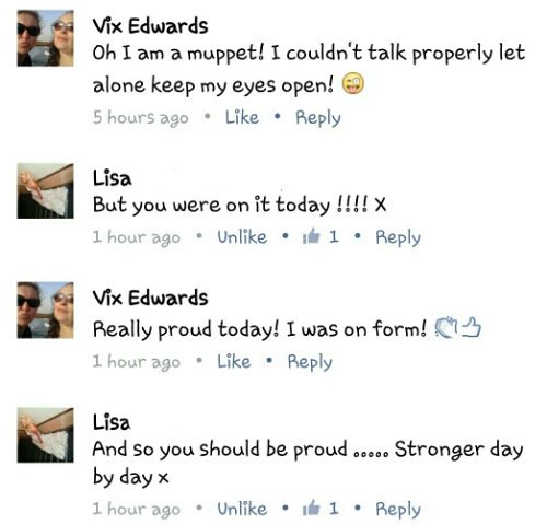 A lovely thing from today’s class was what the instructor wrote on my Facebook post I shared about forgetting to take my medication last night and how it effected me.