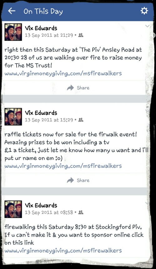Oh my days! This was my post, this day FOUR years ago! Counting down to the firewalk fundraiser we organised for the MS Trust!